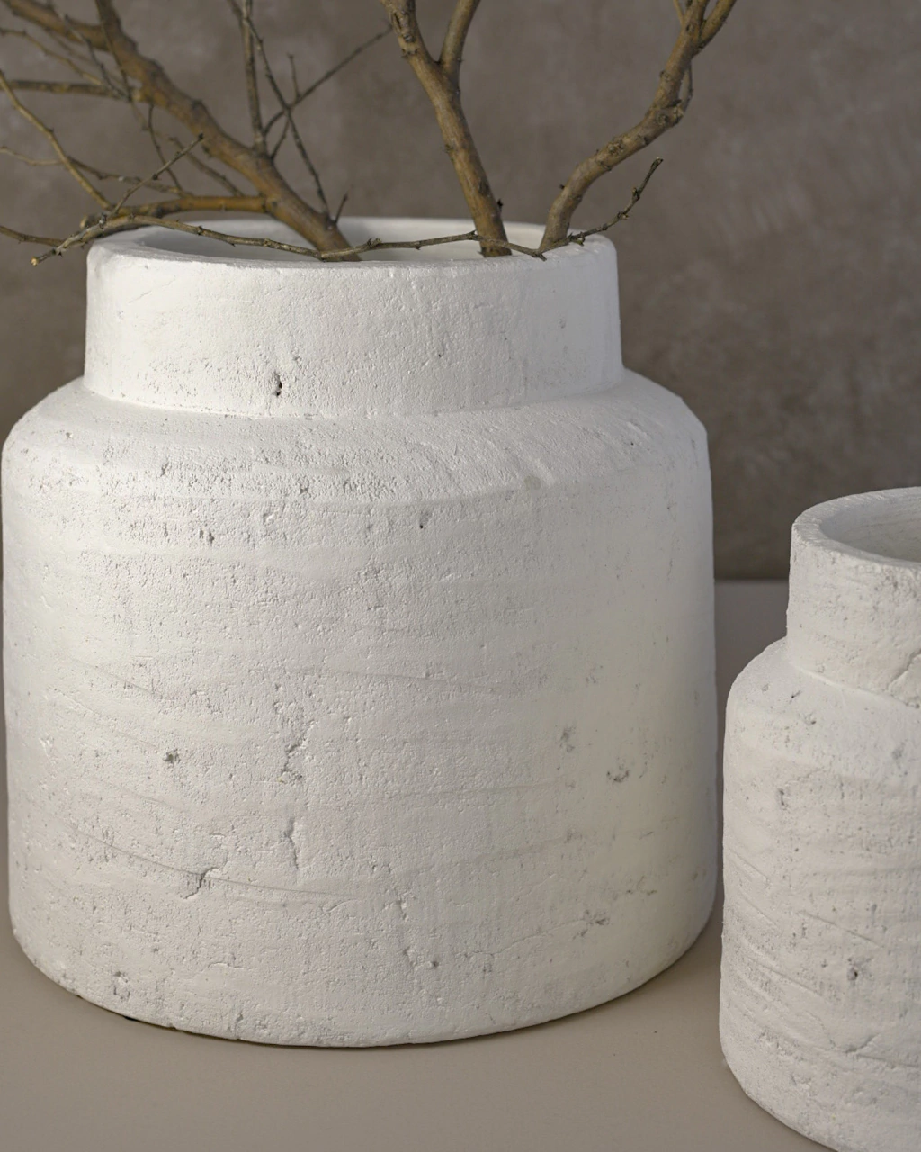 Tinaja Giza, una pieza única en cerámica con una textura rugosa que evoca la tradición artesanal. Su acabado en blanco mate y su impermeabilidad la convierten en el complemento ideal para tus espacios, aportando un toque rústico y elegante a la vez.