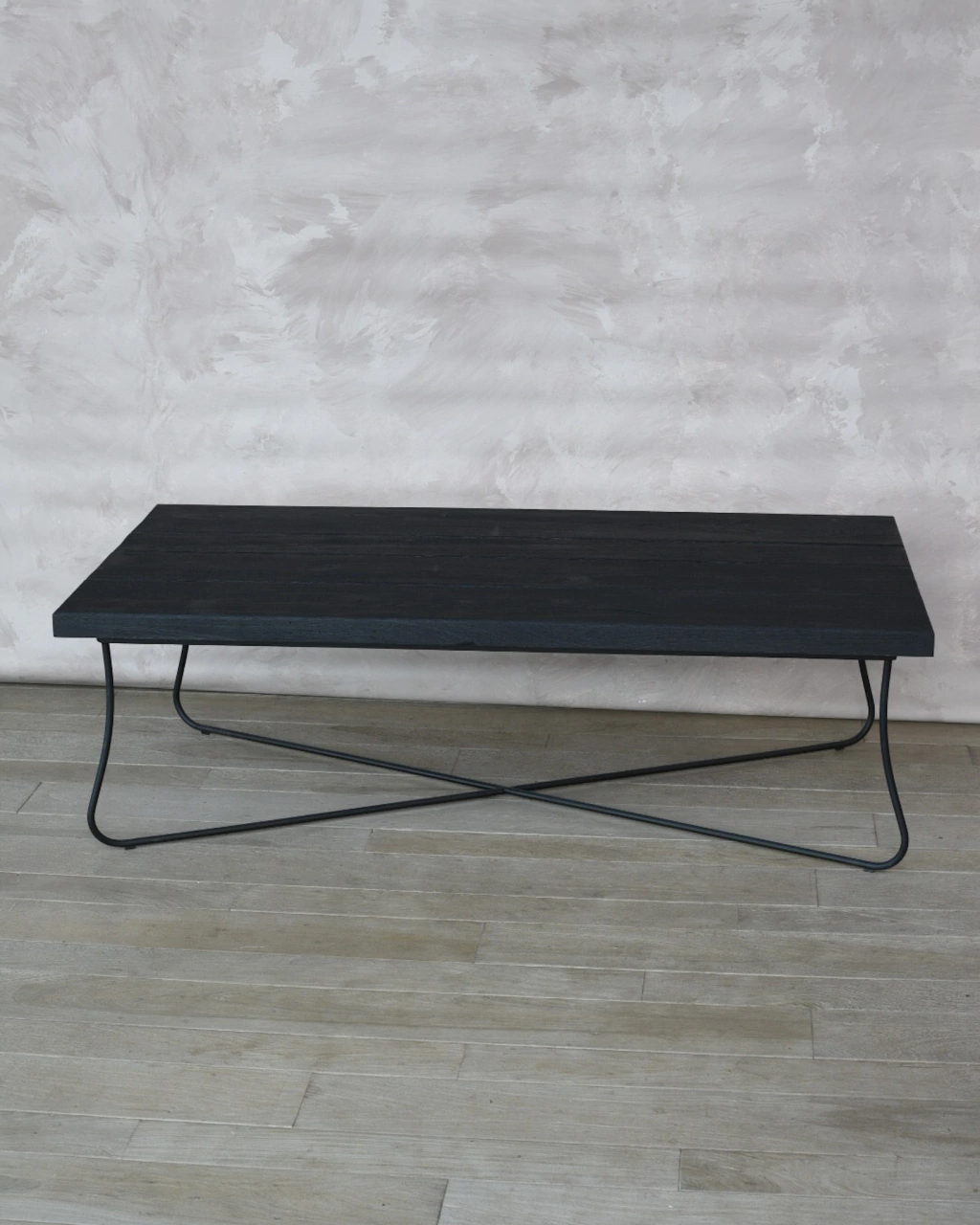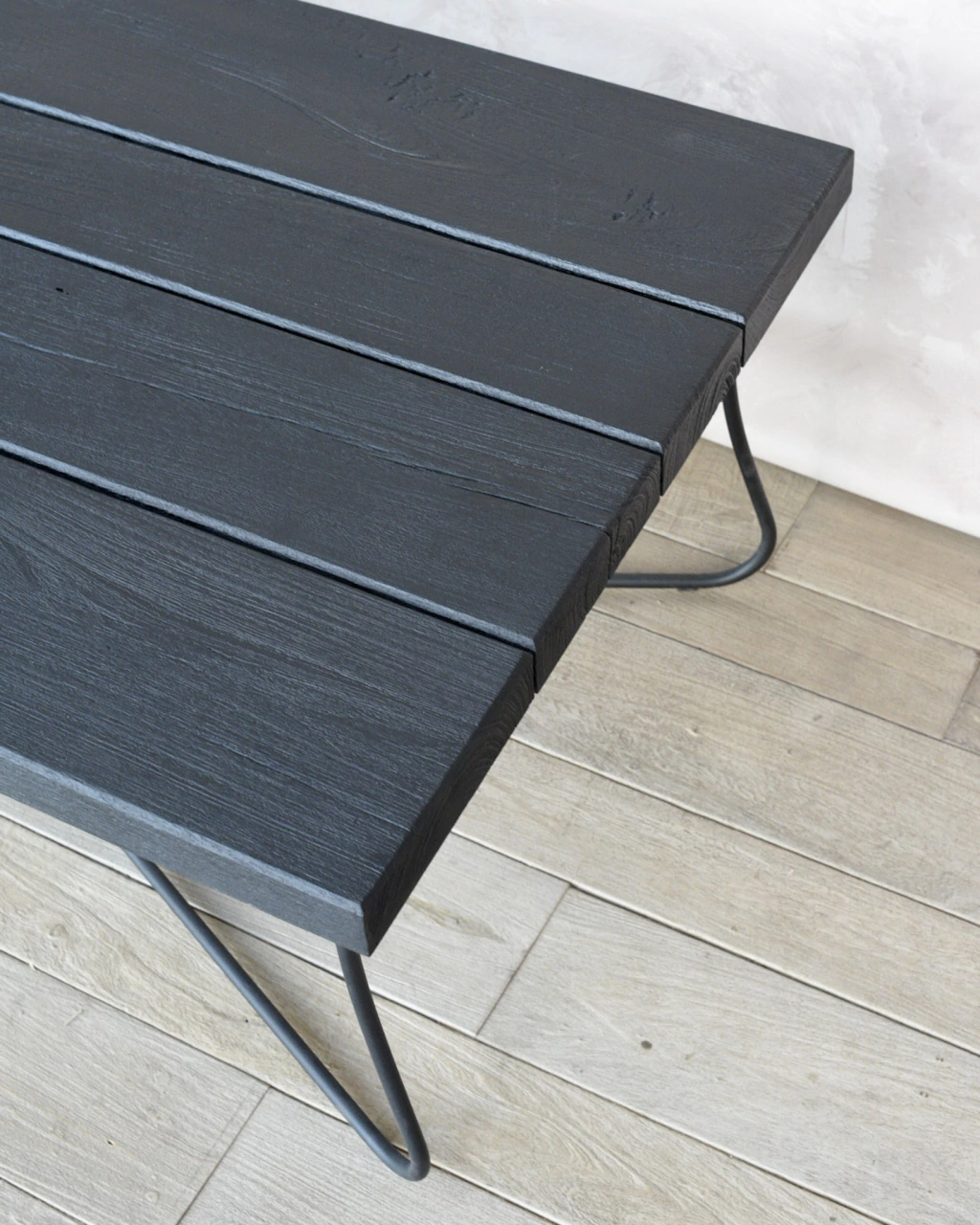 Realizada en madera maciza de Petiribi de 2" de espesor y base de hierro. Terminacion enarenada, tapa deck, lo que la convierte apta para espacios semicubiertos o galerias.